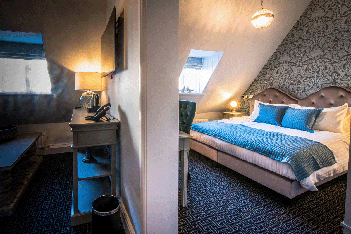 There is one suite which comprises a bedroom with twin beds (put together these make a really comfortable super king sized bed), a living room with a sofa bed (ideal for families) and an en-suite bathroom with an oversized rain shower. Both rooms have flat screen TVs and share tea and coffee making facilities.
